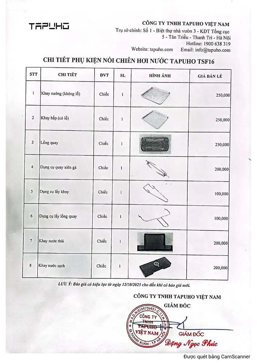 Dưới đây bảng giá Phụ kiện nồi chiên hơi nước TSF16 TAPUHO công khai: