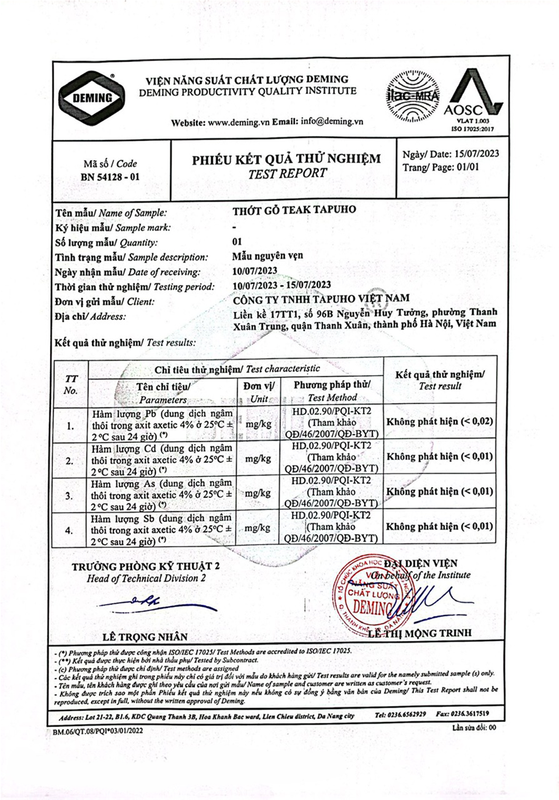 Kết quả thử nghiệm sản phẩm Thớt Gỗ TEAK TAPUHO do Viện Năng Suất Chất Lượng Deming chứng nhận