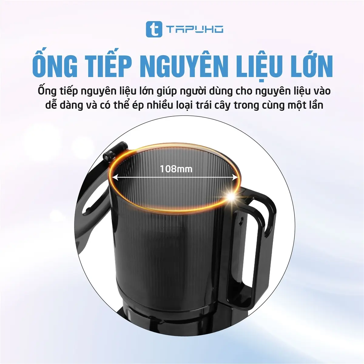 Máy ép chậm TAPUHO TSJ66 có ống tiếp nguyên liệu lớn với miệng ống có đường kính lên tới 108mm giúp bạn cho nguyên liệu vào dễ dàng và có thể ép nhiều loại trái cây trong cùng một lần. Người sử dụng không tốn nhiều thời gian cắt, bổ nguyên liệu quá nhỏ như ở các dòng máy có ống tiếp nguyên liệu nhỏ.