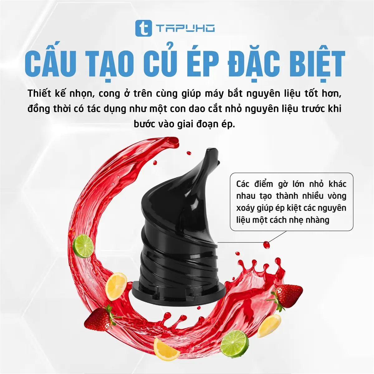 Củ ép được thiết kế nhọn giúp máy bắt nguyên liệu tốt hơn. Xung quanh trục ép là các điểm gờ lớn nhỏ khác nhau tạo thành nhiều vòng xoáy giúp ép kiệt các nguyên liệu một cách nhẹ nhàng.