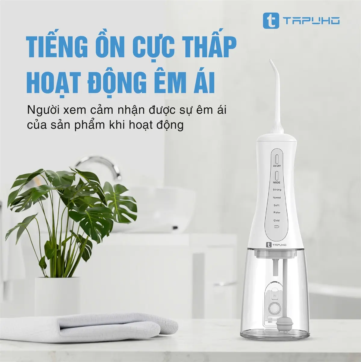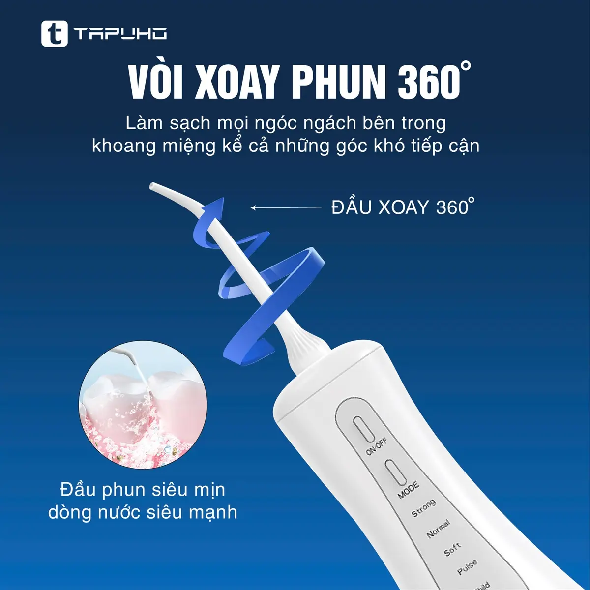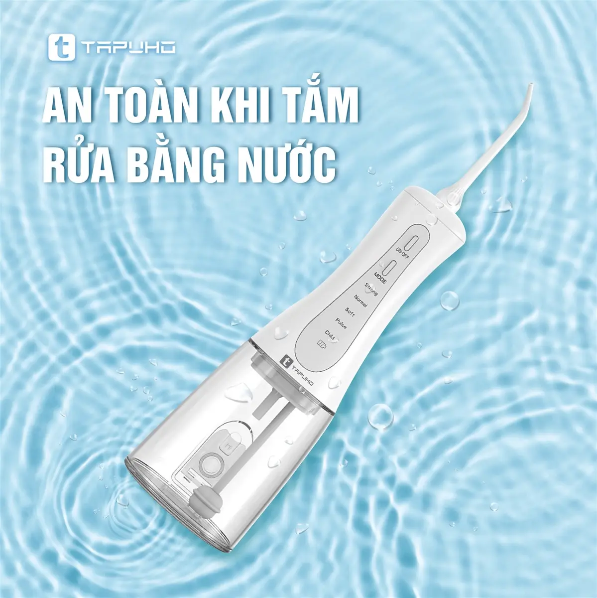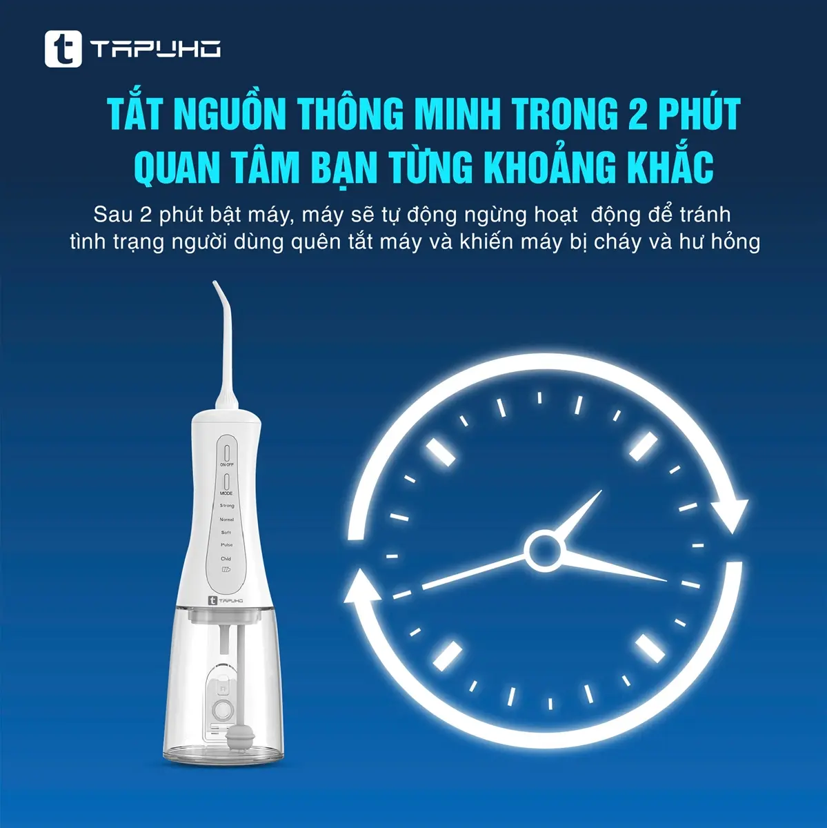 Cơ chế hoạt động đặc biệt: Tăm nước thông minh TAPUHO TWT2025 được thiết kế với cơ chế phun đứt đoạn theo từng nhịp. Các xung động nước tác động vào nướu và len lỏi qua từng kẽ răng, giúp làm sạch và mát-xa nướu hiệu quả mà không gây tổn thương cho nướu. Điều này đảm bảo răng miệng của bạn luôn được vệ sinh kỹ càng và khỏe mạnh. Đặc biệt, máy còn được thiết lập cơ chế khởi động tiếp sức 1 giây rất an toàn cho nướu: khi máy bắt đầu hoạt động, lực phun sẽ bắt đầu với lực phun thấp để nướu làm quen với lực nước phun, sau 1 giây tiếp sức lực nước sẽ trở lên bình thường.
