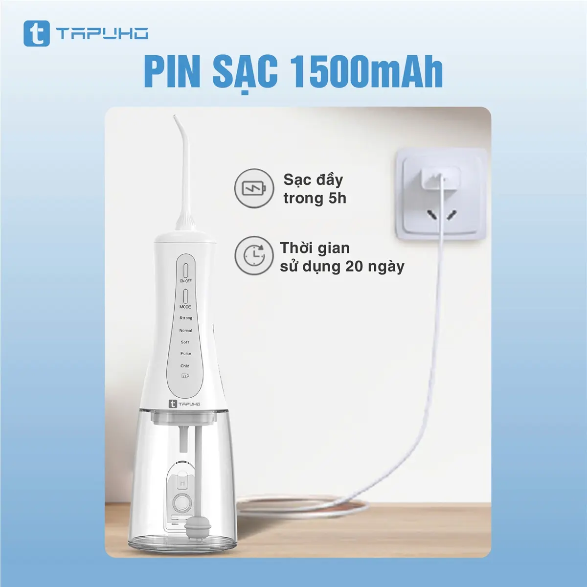 Dung lượng pin lớn: Tăm nước TAPUHO TWT2025 được trang bị pin Lithium lên đến 1500mAh, sử dụng cổng sạc USB type-C, sử dụng thoái mái trong các chuyến đi công tác, du lịch dài ngày mà không cần phải lo lắng