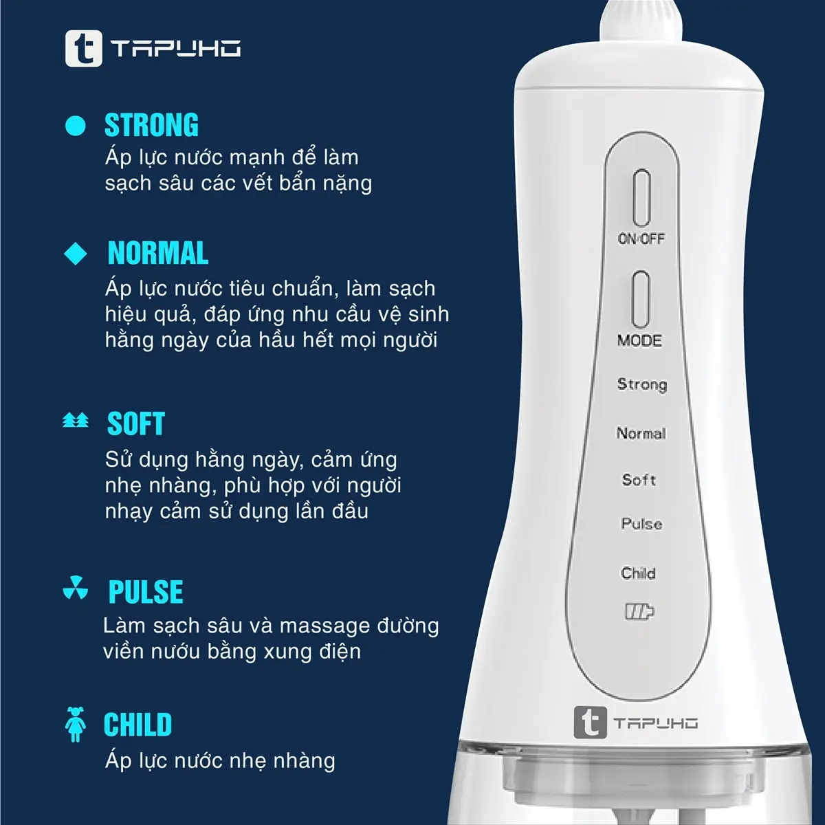 Chế độ đa dạng: Tăm nước TAPUHO TWT2025 gồm 5 chế độ tương đương với 5 áp lực nước khác nhau, phù hợp nhiều độ tuổi từ trẻ em đến người lớn và các đối tượng có nhu cầu sử dụng khác nhau: